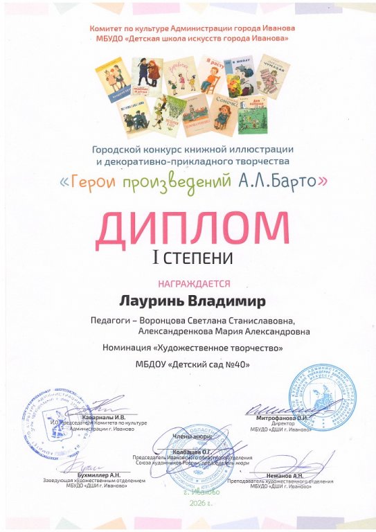 Поздравляем Лауринь Владимира с победой в городском конкурсе книжной иллюстрации и декоративно-прикладного творчества "Герои произведений А.Л. Барто"! |