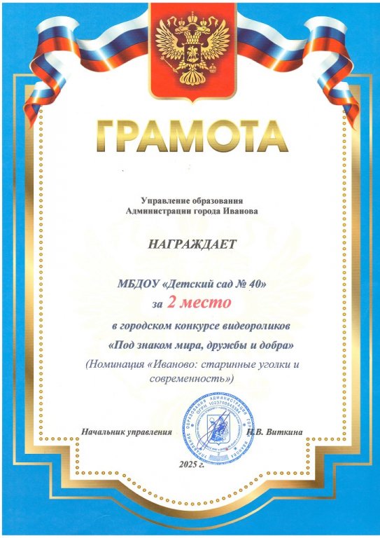 Наш детский сад принял участие в конкурсе видеороликов "Под знаком мира, дружбы и добра!" в номинации "Иваново: старинные уголки и современность" и занял 2 место!