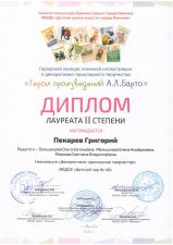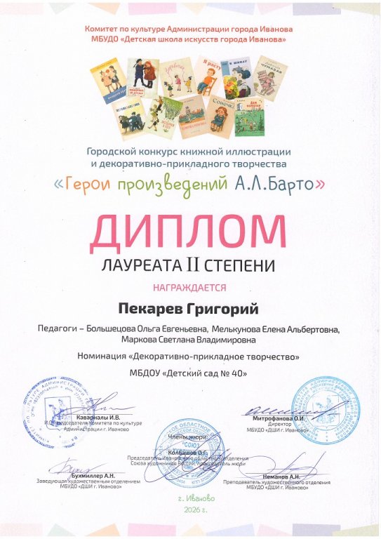 С огромной радостью поздравляем наших воспитанников с победой в городском конкурсе книжной иллюстрации и декоративно-прикладного творчества «Герои произведений А.Л. Барто» :Пекарев Григорий — ЛАУРЕАТ 2 степени!